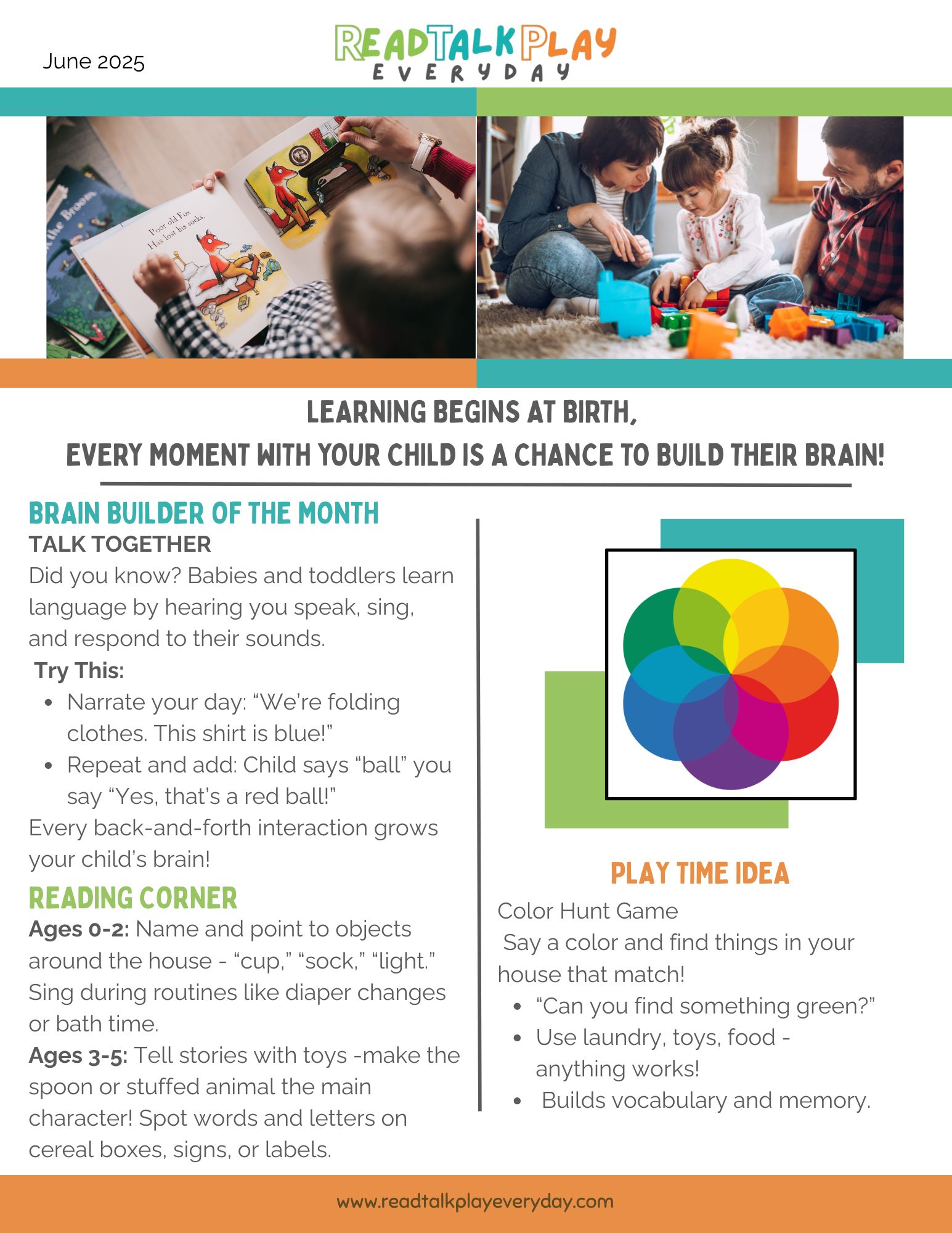 Why? Because learning begins at birth, and families are a child’s first and most important teachers. Early brain development doesn’t require special toys or hours of planning; it happens in the everyday moments you’re already sharing with your child.