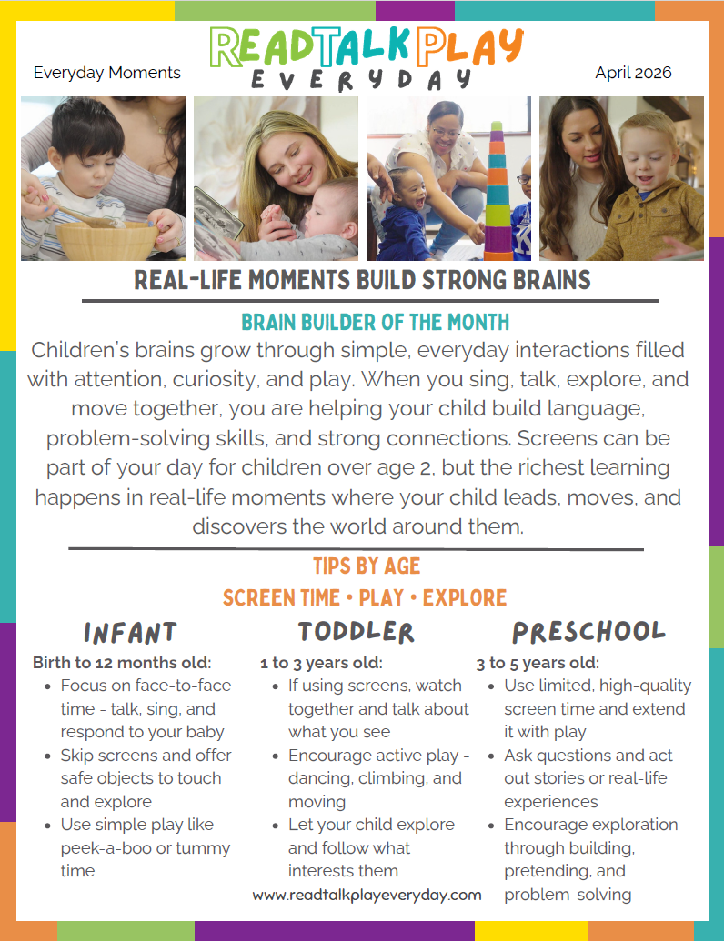 As we celebrate the Week of the Young Child this month, it’s a great reminder that learning happens everywhere. Whether you’re singing a song, exploring outside, moving and playing at home, or following your child’s curiosity, these small moments build strong brains and lasting relationships. You don’t need extra time or special tools – just a few intentional moments each day. Explore more simple ideas throughout our site and keep making the most of the moments you already have.